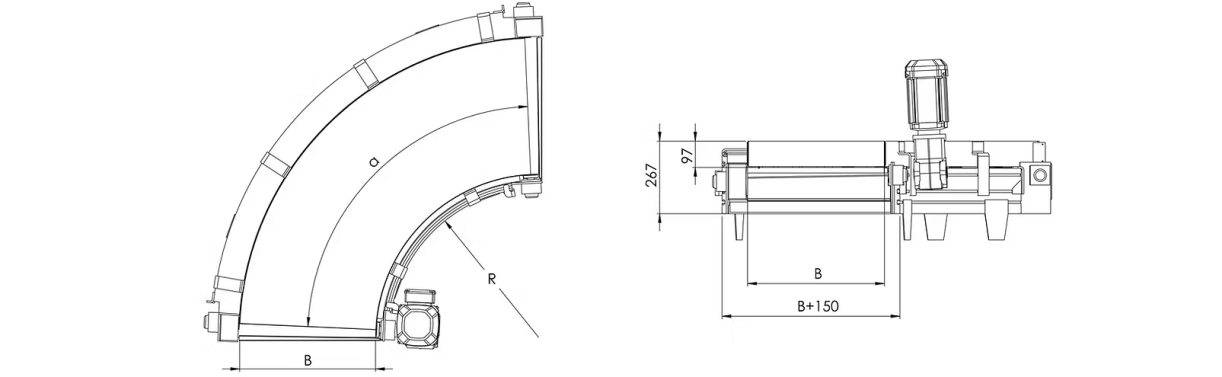نوا نقاله خمیده 30 درجه (30° belt bend) "قوس تسمه" بهگونهای طراحی شده است که جهت حرکت بار را بدون تغییر موقعیت نسبی آنها نسبت به شیبها تغییر دهد. در این سیستم، تسمه درون پروفیلهای هدایتکننده قرار دارد و حرکت روان و دقیق اجسام را تضمین میکند.